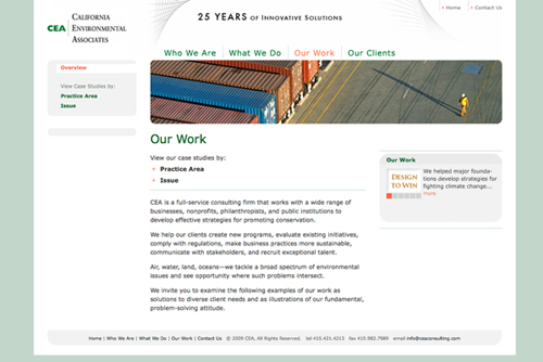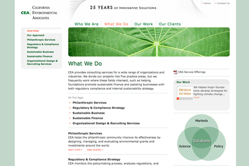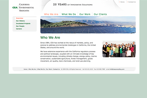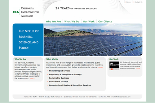 Redesigned the California Environmental Associates website. Worked on all landing and subpages. Chose the images displayed and matching color block.