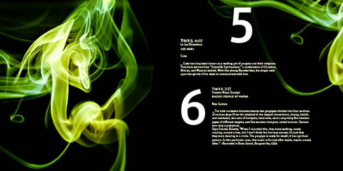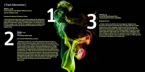 Designed CD packaging and all related parts (booklet, cd cover, etc) for CD Dancing with the Dead which is a compilation of various death rites from around the world. Developed the idea of the universal use of incense and death. The CD package comes with a package of 12 different incense smells and also contains a incense holder once the CD is removed. |