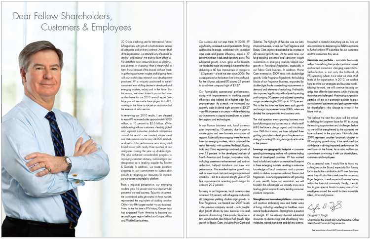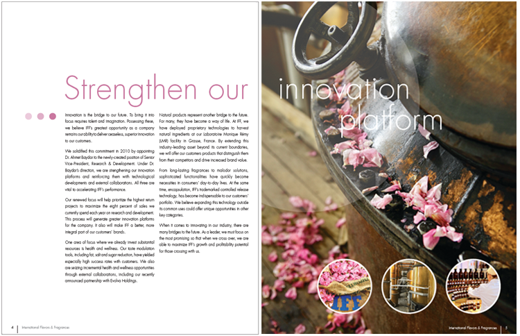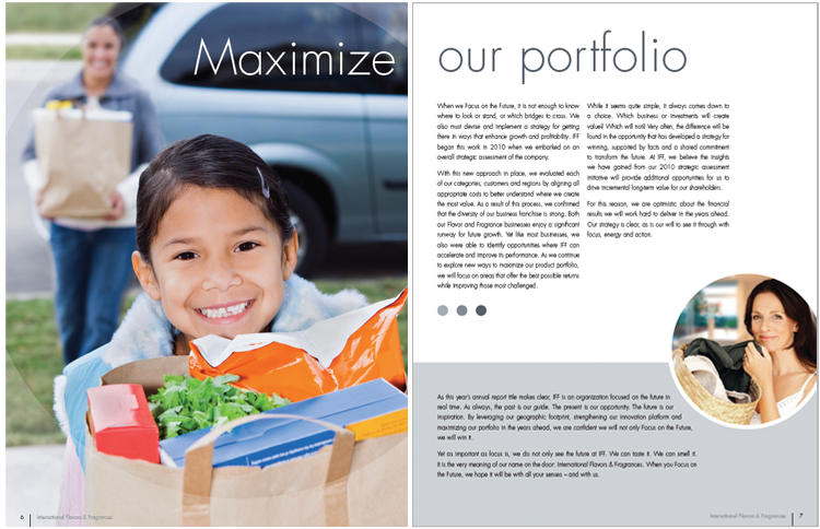 In the International Flavors & Fragrance 2010 Annual Report, the IFF message to the shareholders "more to come" is signified through the use of elipses. Each page keeps the same typographical treatment but uses abstracted elipsis circles to dynamically compose each page.