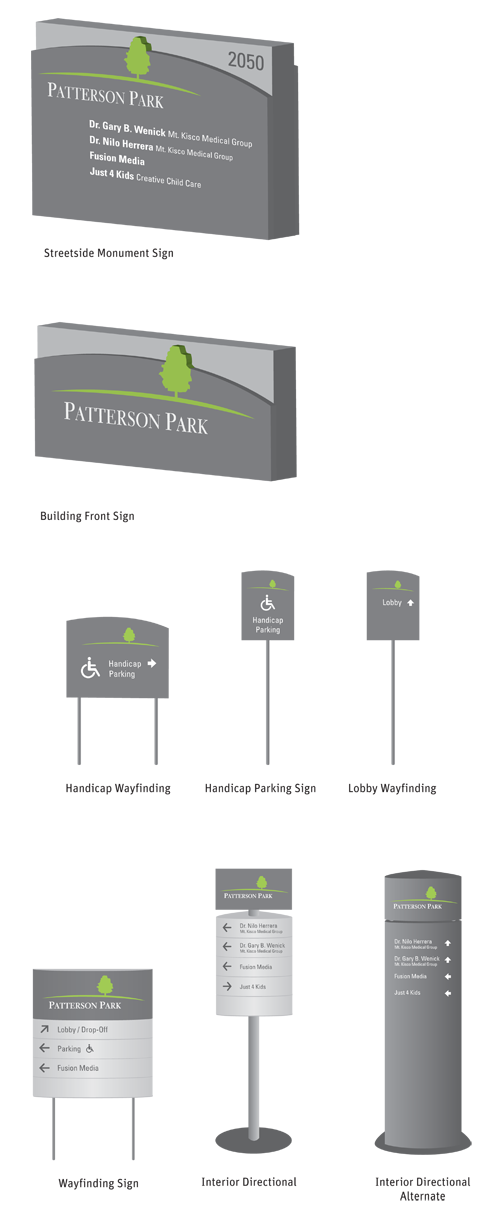 Developed the signage system for Patterson Park Business Offices. After conducting a site survey, a set of appropriate signage was chosen. For the monument sign, placement was chosen due to difficult visability from the road. The client also specified the need for more directional handicap parking signs. (with/Fusion) |
