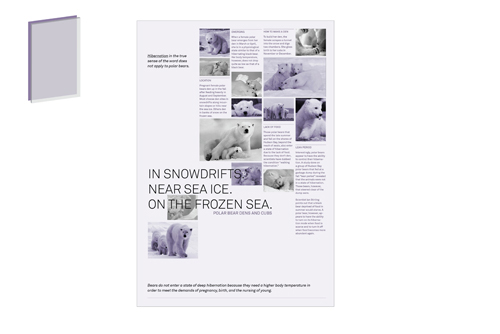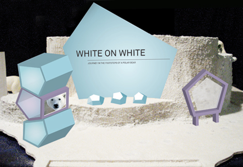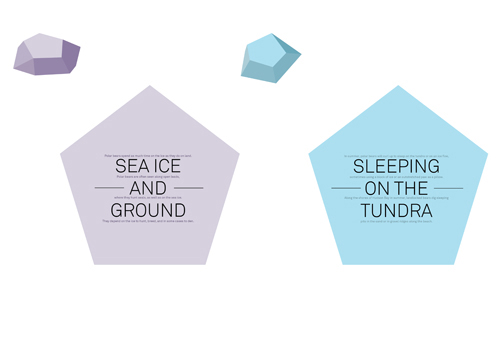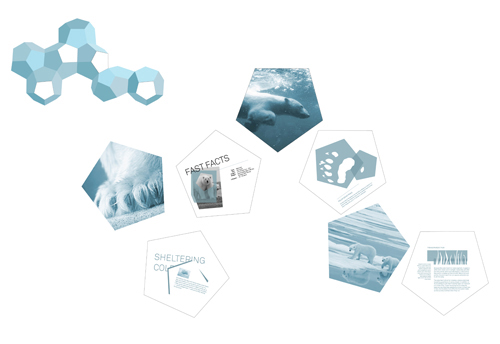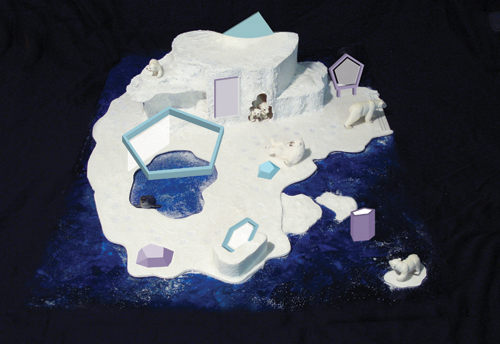 This polar bear exhibit was designed to tell the viewer 4 different stories about the polar bear. Through the use of bear footprints on the floor, the viewer is lead around the space. The exhibit is displayed on a giant iceberg surrounded by water. The polar bear’s environment is very pivotal to its character and behaviors. |