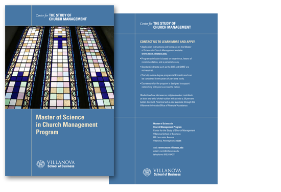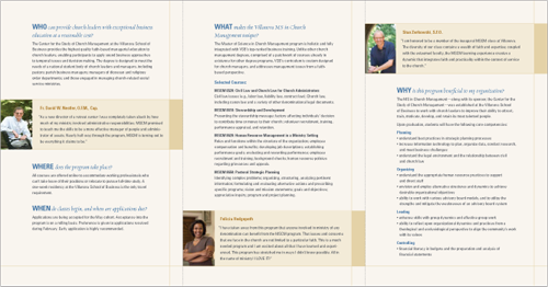 Created layout for the Master of Science in Church Management Program. Used existing color scheme and structured the brochure with linear elements breaking up the space into distinct sections. Highlight quotes are called out on each page. Formated text and chose cover image.